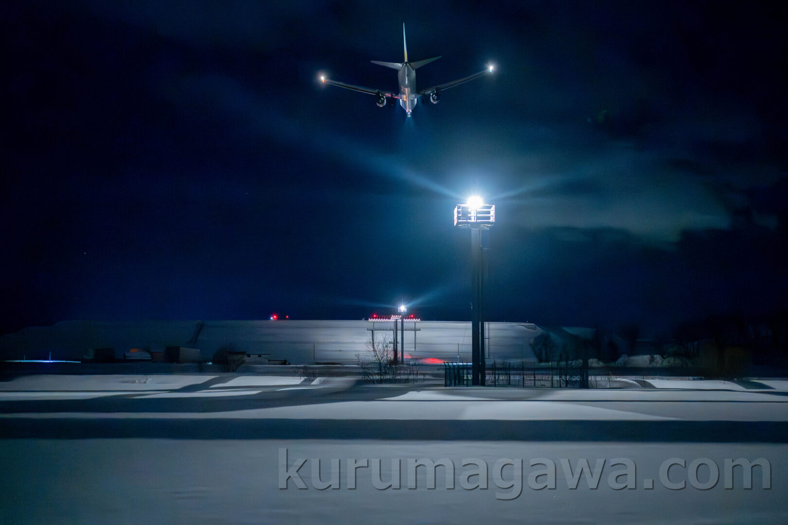 撮影タイミングは、日没直後のいわゆるマジックアワー。直射光を避け、拡散した斜光を選ぶことで、胴体側面の陰影が柔らかく、塗装の質感やロゴが破綻なく再現されている。雪面からの反射光も加わり、機体下面まで均一な明るさが保たれている点は、冬季撮影ならではの利点だ。