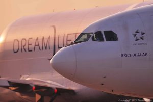 TGの夕方便 LCFが来ていたので絡めてみました 機長のシルエット タイ人らしい?横顔です