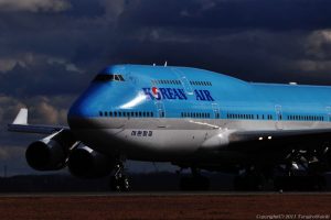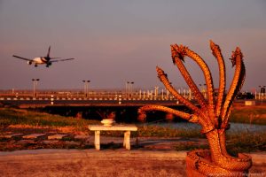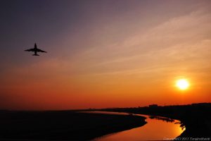 これは自動車専用道を走る車中からの撮影 通りかかったときに運よくB747が離陸 更に眼下には夕陽を映した水面が 「oh!」と声を上げると車の速度が落ちる ドライバーとも息が合ってきました
