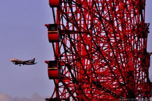 大阪駅からの構図 ここで空港まで約5マイルの位置 エアバンド聞きながら空を見上げていると、周りの人も同じ方向を見つめます 今度は観覧車から狙ってみたくなりました 奥が深い伊丹です