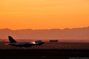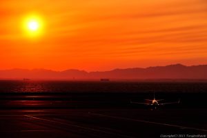 真ん丸の夕陽 露出に迷いました 滑走路のテカリに露出を合わせ Mモードで置き露出 ランディングランプが消灯しないことを祈り 着陸機が正面を向くのを待ってシャッター切った