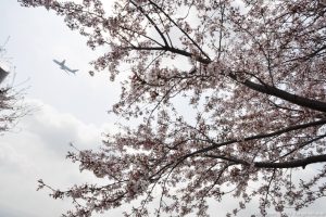 阿蘇方向へ一気に高度を上げる機 すっきりしない空が残念ですが、散り際のチャンスで撮った一枚 花と飛行機 どう撮ってよいのか、さっぱり分からないのは花の方です