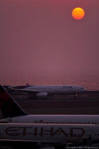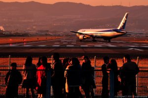 芦屋航空祭の帰りに寄った福岡空港 強烈な西日が刺していました いつもは逆光で狙うのですが、余りに機体がいい色だったので真下から 空のブルーを引き立てた斜陽でした