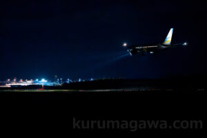 先日あげた月の道は機体を後ろから これはランウェイ上にいる期待を横から撮影 月のスポットライトを浴びているようにも見える 敢えて手前の照明柱やエプロンを入れている