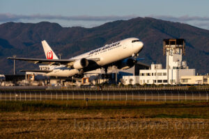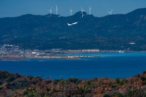 風車が見える空港といえば稚内 そして山陰にも風車が点在する 同じ日本海からの風で発電している 風車の白とJALの白がいい感じに並んだ