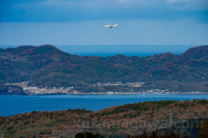到着便を公園で撮ったので変化が欲しい 海岸へ向かっていつもの進入灯を撮る 高度は高いとわかっていても更に高い 太陽を背後に置いて進入灯をクッキリと