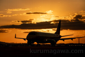 熊本空港と同方位の出雲空港ランウェイ 誘導路がないことが熊本との大きな違い RWY25で出て行く機はターンニングパッドで180°ターン 夕陽を背景に大技を見せてくれた