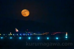 前夜はまだ明るい空に現れた月 翌日は真っ暗な空にドロローンと出現 全容を現したころにFDAがタキシング 美しい月だった