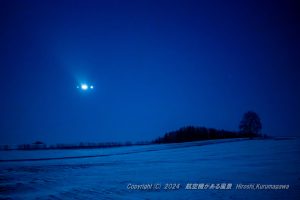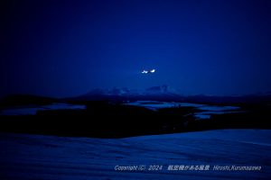 上空から見ていても雪はテカテカ 春の雪だとはっきりわかるのだ 一本木をアクセントに闇の中で試行錯誤 機体が近づくにつれ雪の表情が見え始めた