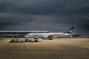 キャセイ機が数機停泊していた 香港に台風が来ているとか 沖止めのお陰でいいアングルになった 背景の空もいいじゃないか