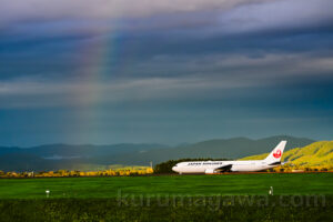 JL556がタキシングを始めた途端 虹のようなものが見えるような気がした しかしその場所では虹は場外だったのだ 急遽場所を変えてなんとか撮影