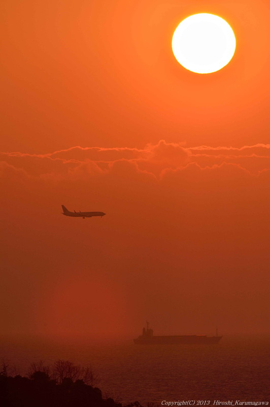 春の空 2013.02.07 a.中部空港 ピリッと張り詰めた冬の空気 もう今年は終わってしまったようだ ゆるゆるの空気の中 夕陽 雲 飛行機 船 林、少々役者が多い しかしこれ、ロクヨン一本勝負でノートリミング ギリギリセーフだ