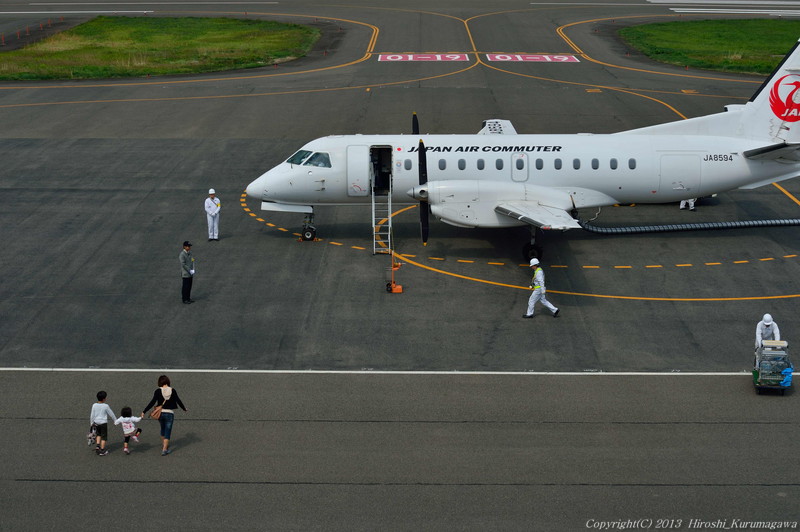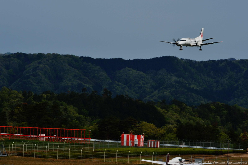 コウノトリ空港 2013.05.16 3.但馬空港 大阪伊丹空港との間を日に二便 空港内にはYS-11が展示されている 初便の到着が9:35 構内の無料駐車場に続々と車が埋まってゆく 但馬から想像するのは山深さ 着陸の様子は空よりも森を多く入れてみた 折り返しの出発は25分後の10:00 定員の割に、優先搭乗を利用する親子連れの姿が多い あっという間に帰って行ってしまった