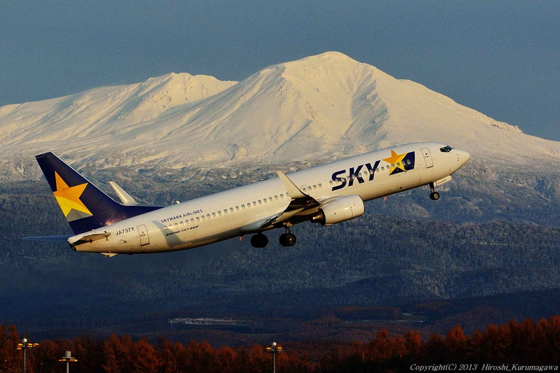 Autumn & Winter 2013.11.16 8.旭川空港 予報では終日「曇り」だった旭川 千歳で改めて確認すると「晴れ」に変わっていた その時すでに12時を回っていた 日没は16時前 千歳から旭川まではのんびり行けば3時間はかかる 駆けつけても精々1便撮れるか否か 向かうことに決めた 辿り着けば大雪山系がきれいに見えた、ふもとには紅葉 わざわざ来たものの、撮った数は10枚程度 翌日は超悪天候に見舞われ、何も撮らずに千歳へ戻ったのだった 金と時間をかけた一枚になってしまった