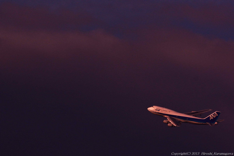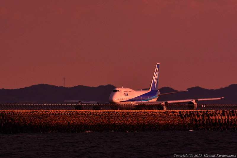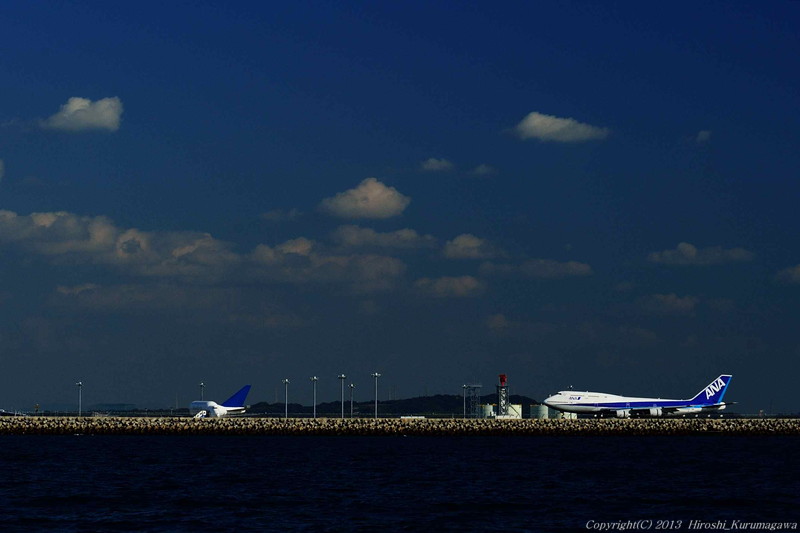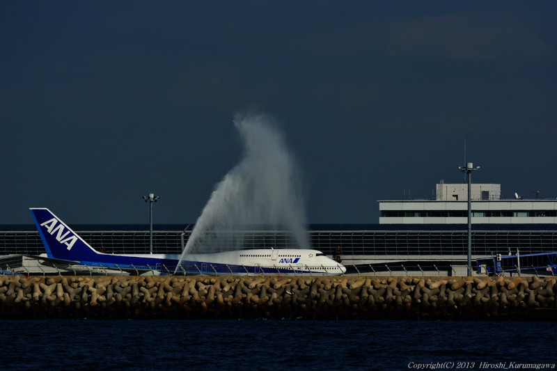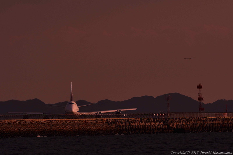 惜別 海上から 2013-11-23 最終更新日時 : 2013-11-23 昨日11/22は、ANA B747の里帰りフライト セントレアの日 午前中に到着していたドリームリフターが絡んだ 進入経路は機長の計らいか、サイドからバンクをかけて降りてきてくれた セントレアらしいB747を残すための脇役 それはドリームリフターであり、管制塔であり、様々 歓迎の放水アーチ 約一時間の折り返し時間で那覇へ向かう 特徴の頬を夕陽に染められローリング この巨体が沢山舞っていてくれたら、どんなに写真を撮りやすいだろう B747の退役が報じられて久しい 昨日はいよい終わりが近づいていることを感じた
