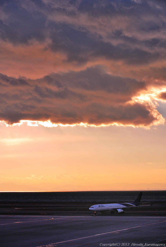 神雲現る 2013-12-21 最終更新日時 : 2013-12-21 昨日、所用があってセントレアへ出かけた 日中から壁のような雲が漂っていたが、どのように演じてくれるかは想像できなかった 冬至を目前にする今、15:30にはこの陽射し 雲の表情だけで十分燃えていたが、そこへTGが降りてきた 欲を言えば機体に光が欲しいが、神々しい情景に目を奪われた