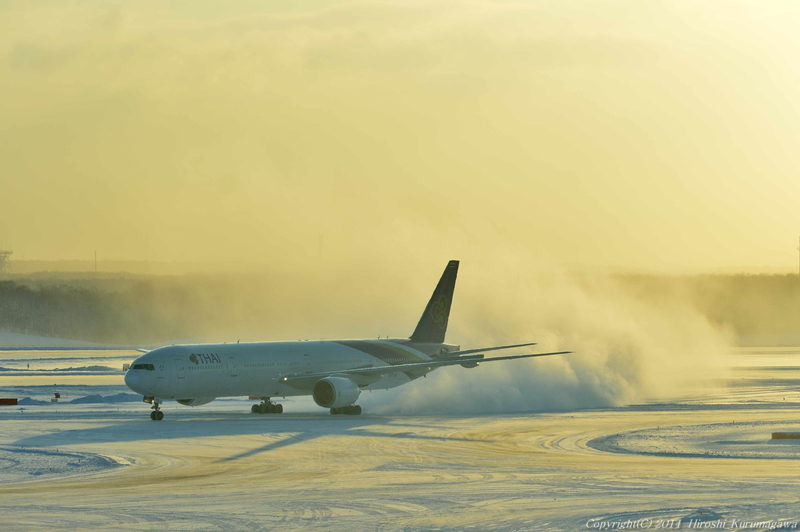 豪雪のあとで 2014.01.30 a.新千歳空港 前夜から猛烈な降雪があった 二本ある滑走路を交互に使いながらの除雪作業で遅れや欠航が発生 空港内のホテルに泊まっていたが、一晩中つづく除雪作業を見ていた 一夜明ければ快晴 そこに到着したTG 恐らく生まれて初めて雪を見るタイ人も搭乗しているのだろう