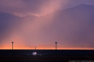 離陸するときに斜め前から切り取る 最も力強い構図 それに夕陽を浴びてるとなれば最高だ 背後の生駒山が伊丹らしさを語る 少々上下のバランスが悪いが、まあいいだろう