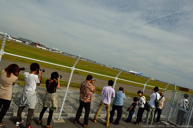 セントレアフォトコン 2014.10.08 a.中部空港 授賞式のあとは恒例の制限区域撮影会 滑走路横にある檻に収監されて撮影するのである こんな感じだ 一枚目のアシアナFが最もしっくりきたカットだが、これはゴージャス デッキにいる人たちを意識してシャッターを押した 来年にはもう見ることができないのがこれ 今月中にA330に置き換えられる