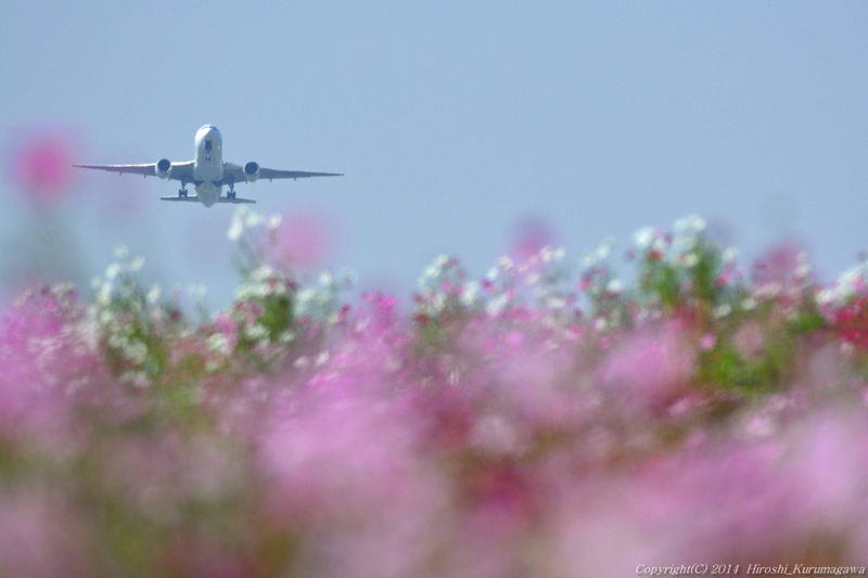 昼の夢 2014.10.22 a.熊本空港 空港から少し離れたところに秋桜畑を見つけた おおよそランウェイ方向だと思われる方向に花を置く 離陸機のエンジン音を頼りに立ち位置を微妙に調整 あっという間のエアボーン ボケボケの感じが寝ぼけ眼で撮った感じだろう