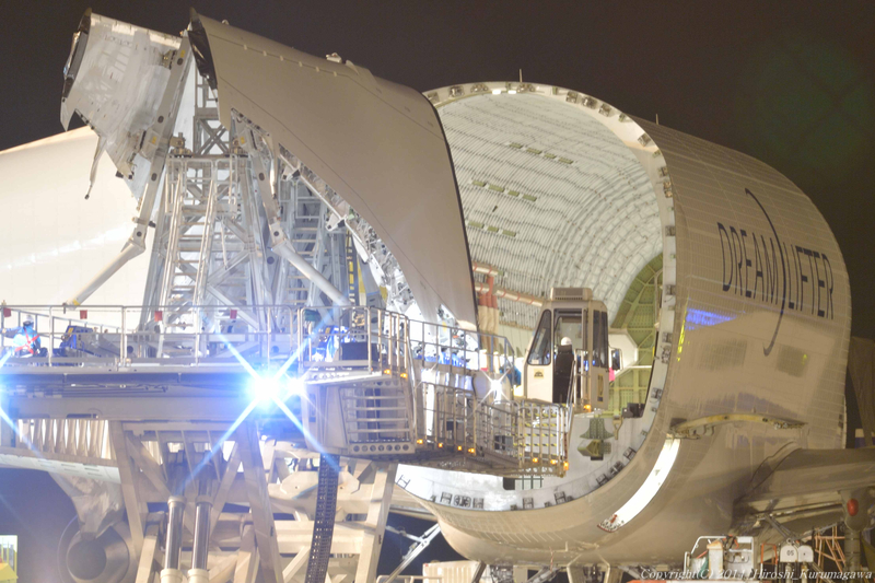 師走 2014.12.02 a.中部空港 最近とても忙しそうなドリームリフター 以前は一泊してから帰って行ったので、クルー達は栄で豪遊するのが楽しみだったと思う 今では到着すると同時に積込が始まり、数時間後には飛び去ってしまう ドリームリフターの内部がどうなっているのか・・・ 白く塗装されてるぜ