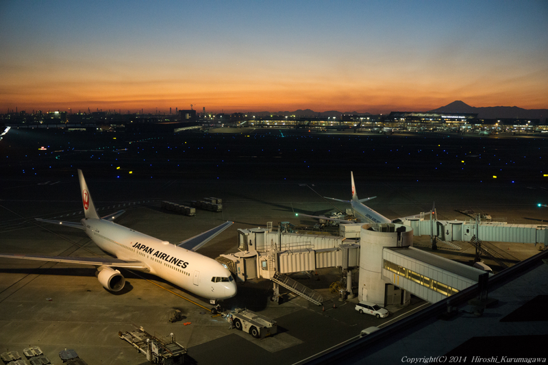 定番構想 2014-12-29 最終更新日時 : 2014-12-29 富士のシルエットが見えたので第一ターミナルビルの屋上へ向かった 既に陽は落ちている これからが勝負の時間 滑走路が闇に包まれ始め 機体と空が同じ明るさになったその時がチャンスだった