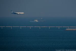 開港10周年記念でクルージングに参加 RWY18で降りてくるので、船をここに留めてくれた 慣れないポイントなのでレンズワークに躊躇 思ったよりも高度があったのでワイド側にパッツンパッツンの状態だ