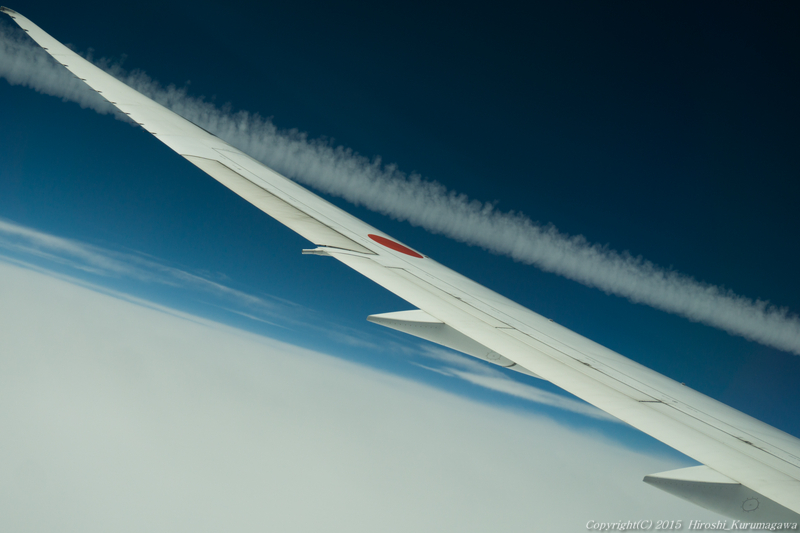 足跡 2015.06.28 c.羽田空港 羽田から広島へ向かった時の画像 上空へ上がったらすぐ横(のように見える)に先行機のコントレイル B787のしなった翼を絡めてみた 上空で見る雲は、ゆっくりと背後へ流れていくように見える とても時速800kmで相対しているようには見えないのだ きっと距離感を見誤っているのだと思うが・・・・