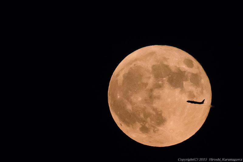 Super moon 2015.09.30 c.羽田空港 最近になって聞くようになった言葉スーパームーン 欧州では皆既月食にもなったらしい この業界では皆が天を仰いでいたので、このような作品は溢れている 単に月を射抜くだけではダメなのだ これは新しく加わったCanon 7Dmark2 + 100-400mm で撮影しトリミングしたもの 手持ちでの撮影だ