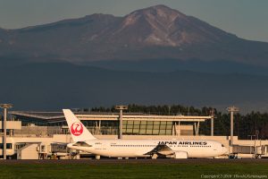 西陽を浴びたターミナルビルやタワーに目を奪われた その時、JALはお尻を向けて駐機場にいた プッシュバックして機体がこちらに向くのを待ってシャッターをきった もう赤い山の頂は白いらしい