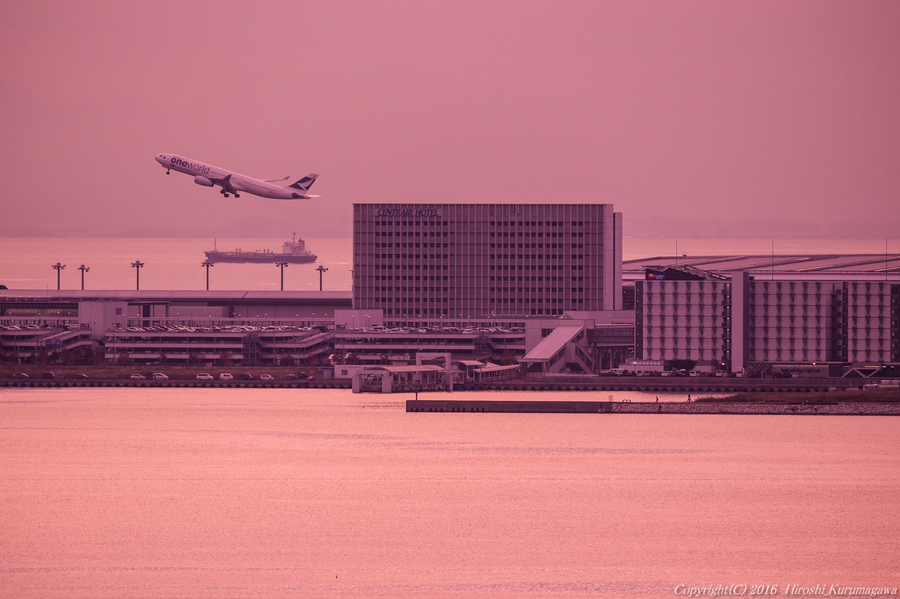 夕の残り香 2016-11-29 最終更新日時 : 2016-11-29 天気が下り坂とは聞いていたが、想像以上にスピードが速かった 16時過ぎのキャセイの離陸、すでに夕陽は雲の中に落ちている 水面に残された夕色を最大限引き出す 今日、最後の一枚になろうと覚悟しえいたら、飛び出してきたのは One World機だった
