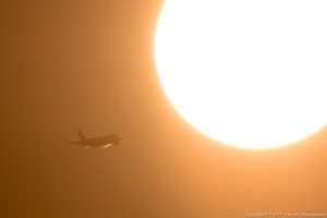 毎日ぼやっとした空の春 夕刻の球も靄の向こう 出発機がそれに向かって飛び込んでいく予感 直視できないのですぐに眼を閉じてシャッターを押し続けた