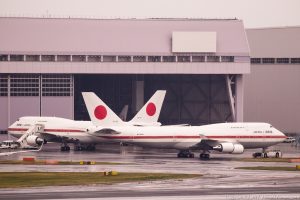 桜が満開の週末はあいにくの天気だった 雨雲予報をみれば夕刻に僅かながら雲が割れそうな気配を感じて羽田へ すると政府専用機が2機とも停泊しているのが見えた こんな日は夜になってからのライティングがいい
