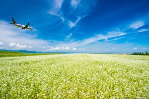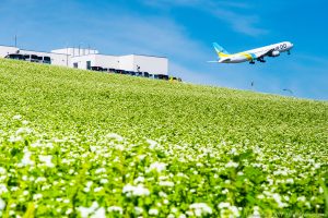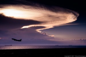 蕎麦とB767を切り取ろうと立ち位置を決める まもなく羽田行きのB767がタキシングを始めようとしたとき 上空にインパクトある雲が流れ始める 急遽構想を変えて雲を主役に切り替えた