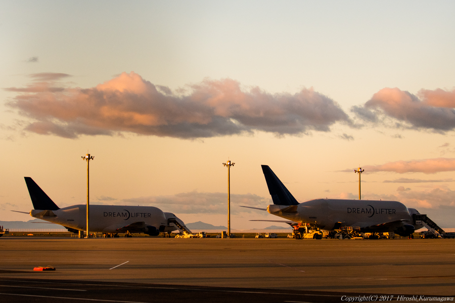 ドリームリフトブラザーズ 2017-09-23 最終更新日時 : 2017-09-23 嵐が去った真夜中に2機のLCFが到着 朝五時に空港へ出向いたのは恥ずかしながら初めての経験 六時前に陽が昇り始めると一気に目の前の色が変わった 四時に降りた方が先に出発するようだ