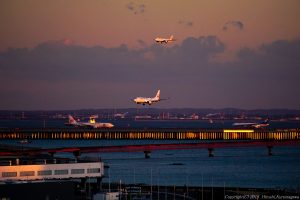 手軽に持ち出せるミラーレス一眼 快晴なので力強い西日を期待して第二ターミナルに立った スピード感を出すために1/250に設定して少々流す 呼吸が合うたびに照明柱が機体に被るぞ