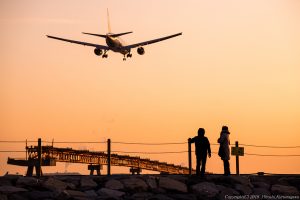 城南島から沖を見ればD滑走路が見える ちょうど降りてきたのがスターウォーズ 黄色い機体が海の青に映えていた 表情が乏しい空なので海を大きく取り込んでフレーミング