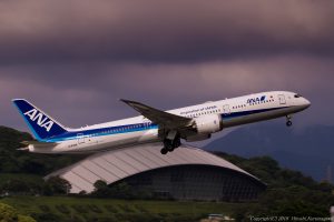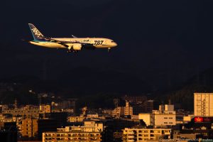 秋晴れの一日だったが、次第に厚い雲に覆われた 日没の時には不気味な光が立ち込める 北の空だけが明るい不思議な感覚 ロゴライトを点けたANAがフレームイン Nikon D850 24-70mm