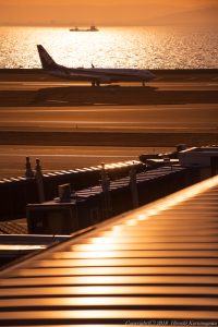 冬至から時間が経ち、もう来月は彼岸 光も海も眠い雰囲気が醸し出される時期だ ボーディングブリッジと屋根、そして海の輝きを縦一列に配した 手前の屋根にフォーカスを合わせた方が春っぽかった