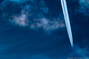 上空にはエキサイティングなコントレイル 雲一つない空よりも表情のある空の方が楽しい 風を感じるさわやかな表情 確か成田から台北に向かうCXだった