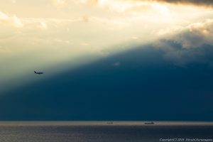 日没の一時間ほど前 三重県上空からは激しい光芒が降り注いでいる 被写体や伊勢湾は陰の中 おかげでLCFがシルエットに潰れなかった