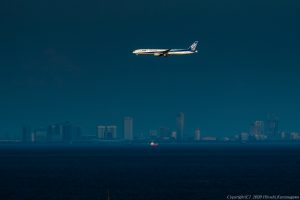 背後には太陽が顔を出しているはずだった(見えない) 次から次へと降りてくる機に光が当たったり当たらなかったり ようやく大型機に光が当たった しかし対岸の千葉方面には雲がかかっているらしい