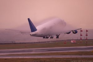 朝方に出発したドリームリフター 陽が当たっているようで当たっていない 尾翼や機体に写り込んでいる光がそれを説明しているかのようだ 三重側に射している陽も不思議な空気感を盛り上げている
