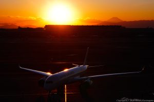 これは富士とA350が役者 白飛びしている太陽は無くてもいいが、機体が反射光を拾っているがポイント 羽田に通いなれている強者なら陽の位置で月日を読めるだろう 私は分からない
