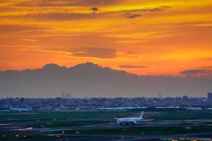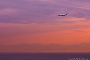 沈んだ太陽の上にある傘雲 きっと富士山上空から流れてきたのだろう 小型機の離陸が続いたが、ようやく中型機がラインアップ 望遠ズームをワイド側パンパンに引いてフレーミング