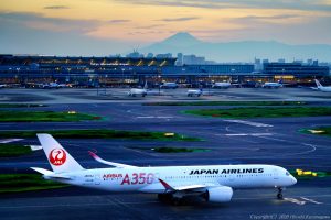 日中は見えなかった富士が日没とともに輪郭を現す 夕空は少々濁っているがこの時期にしてはまあまあ A350が出発するのでJALの赤を意識して待ち受けた 真横を見たときに「A350」のロゴも赤いことに気が付いた