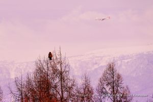 JAL機と山々を絡めた構図を追っていた ファインダー越しに鳥を見つけたのでフォーカスを変更 カラスだと思っていたが、どうも一流っぽい 狙って撮れるものではないので驚いた