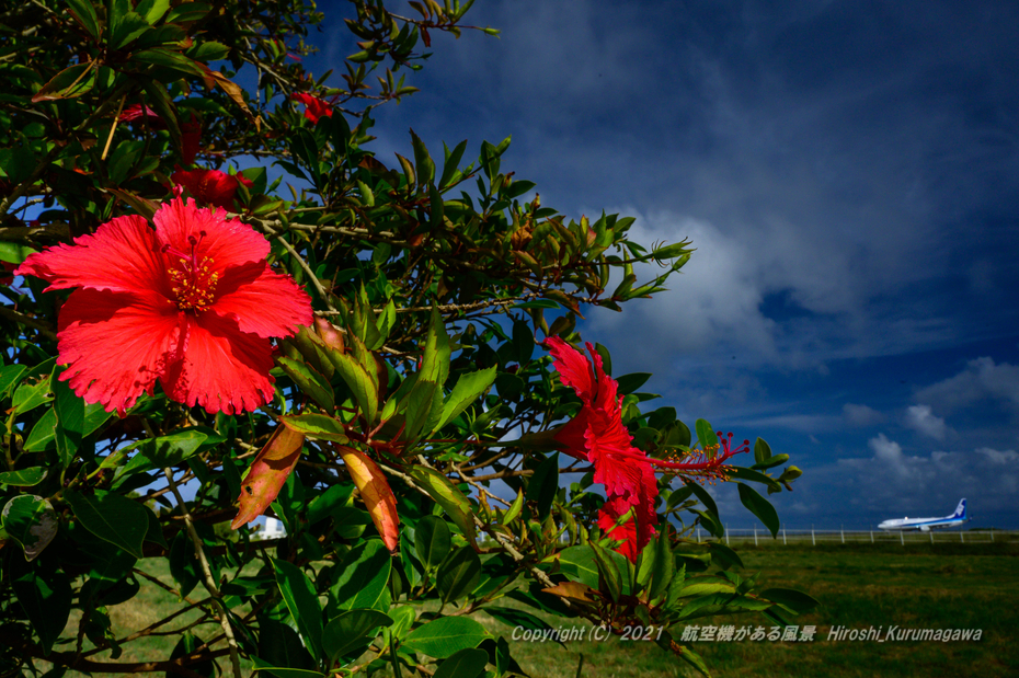扶桑花 2021.07.23 5.石垣空港 扶桑花(ブッソウゲ)、またの名をハイビスカスと言う(らしい) 現地の友人が「ハイビスカスがあればなあ」と言っていたので探した 花に接近してフォーカスを合わせ、ガンガンに絞り切った 景色の中では小さな花なので接近して強調するのだ
