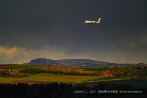 予報では朝から厚い雲に覆われていた 早朝の気温は4℃で青空も見えている 日中は吹雪いたり晴れたり、刺激的な空だった 秋真っ只中、JL555がRWY34で降りてくる 2021/10/17