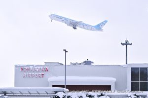 何年か経つと思い出すだろう機体 いつもパワフルに離陸していく姿に圧倒される たまには空港の正面から撮ってみようと考えた 冬の旭川空港ターミナルの絵